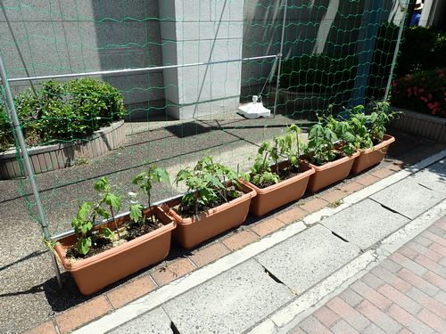 長野市新田町交差点82プラザの南側に、グリーンカーテンで木陰をつくろうと、Φ20ミリのパイプで骨組みを組み立てネットを付設して、ゴーヤの苗を植えました。 昨年よりプランターの数が2つ増えて幅が広くなりました。